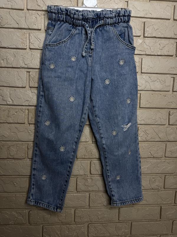 Джинсы для девочки мом цвет голубой на резинке. Украшены вышитыми ромашками и потертости в одном месте (левое колено).
