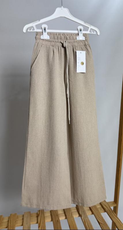 Стильні, легкі брюки палаццо із льону. Колір бежевий, мають кармани, на поясі шнурочок. Дуже комфортні та незамінні влітку.