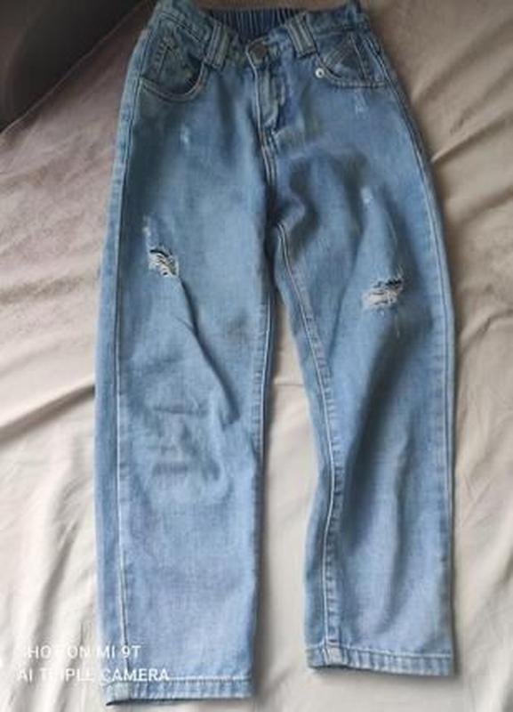 Джинсы на девочку. Размер 140. Довжина 77 см, крок 50 см. Пояс 29 см, бедра 38 см ширина штанини зверху 21 см, низ 14 см.