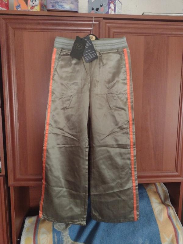 Очень классные брюки на девочку. Низ широкі. Кармашки на попе застегиваются на кнопочки. Пояс резинка на завязке. Цена за одну единицу. Одни на 9 лет а другие на 10 лет.