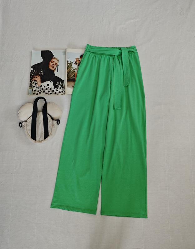 широкие зеленые брюки от Zara высокой посадки с поясом, ткань коттон, для девочки 13/14 лет на рост 164 см, ПОТ 30 см, ПОБ 50 см, длина 93 см, шаг 68 см