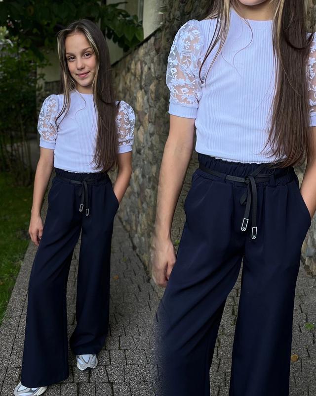 Штани-палаццо Тканина: костюмка Ідеальна посадка Є дві функціонуючі кишені Більшомірять!!!! Розміри: 134см 140см 146см 152см 158см Заміри: довжина з резинкою/крок/бедра/пояс 134 - 85/62/40/27 140 - 88/64/41/28 146 - 92/68/42/29 152 - 95/70/43/30 158 - 99/74/44/31
