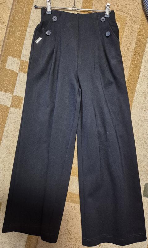 Брюки черные, ткань плотная, красиво ложится, красиво на ребенке. Пояс 29 см не растягиваемый, но сзади резинка и можно растянуть до 35. Можно сейчас надевать,можно и позже с колготками, в школу хоть на праздник, в то же время, чтобы на каждый день. Длина 85 см, на рост 140.