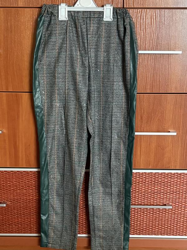 Брюки для дівчинки приємна тканина у клітинку з маленькими паєтками по бокам шкіряні лампаси на резинці на 11-12років