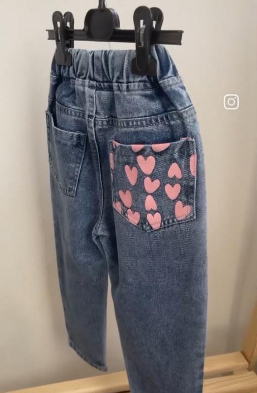 Джинси мом для дівчинки з кишенею в сердечко. Джинс щільний, не тянеться. Якісний вибитий малюнок. Пояс-резинка. Розмір вказаний 140. Підійде на 134. Заміри: довжина 74 см, крок 50 см, пояс 46-70 см