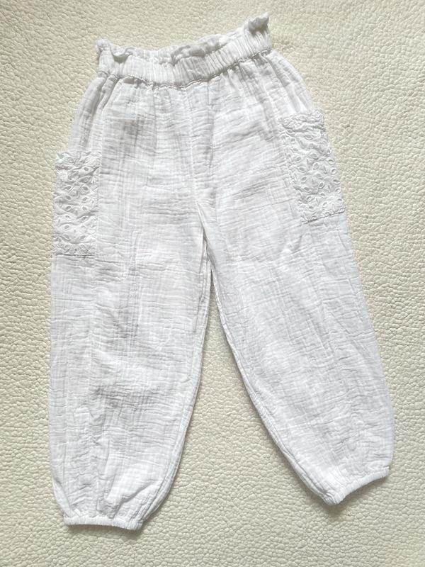 Муслінові штани на дівчинку, легкі та зручні, є кишені у вигляді мережива. Стильні та практичні. Розмір 5 р