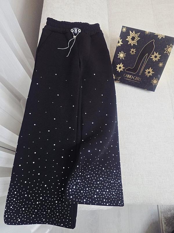 В поясі на резинці Тканина турецька трьохнитка пеньє на флісі Оздоблені стразами Є кишені Тканина не кошлатиться Якість чудова! Заміри: довж /крок /пояс 134-81/ 61/ 25 140-85/ 64/ 26 146-89/ 67/ 27 152-93/ 71/ 28 158-98/ 76/ 30 164-102 /81/ 31