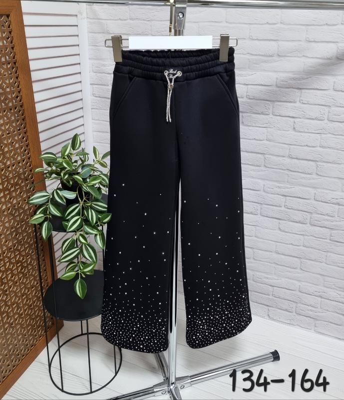 Невероятно красивые палаццо с стразами Ткань турецкая трехнить на флисе цвет ЧЕРНЫЙ Есть кармашки В поясе резинка 134-1 шт 140-1 шт 146-1 шт 152-1 шт 158-1 шт 164-1 шт 🌹134- длина 81,крок 61,пряс 25 🌹140- длина 85,ша 64,пояс 26 🌹146- длина 89, крок 67,пояс 27 🌹152- длина 93,шаг 71,пояс 28 🌹158- длина 98, крок 76,пояс 30 164- длина 102,шаг 81,пояс 31 -+2 см ✅️Цена 1050 грн