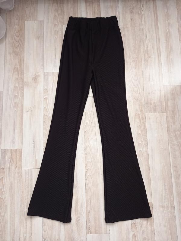 Черные штаны брюки клеш в рубчик как плотные лосины отлично тянутся Бренд Primark на 12-13л Замеры пояс 27 поб32 длина97 шаг.шов 67 низ штанины 20 состояние отличное возврата нет