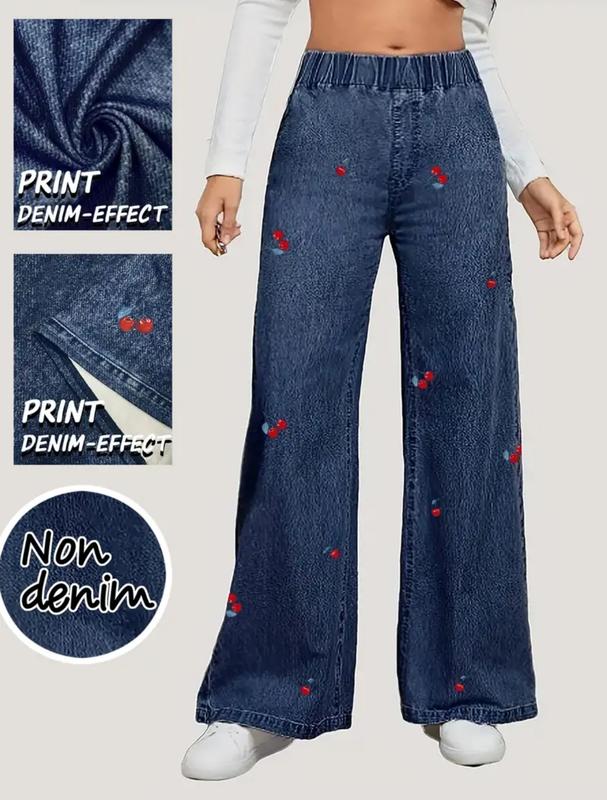 Брюки с широким поясом и принтом 🍒, ткань как в дениме. Высокий пояс, свободный крой, принт с вишнями, эластичный пояс. Размер с Отправка сразу после оплаты))