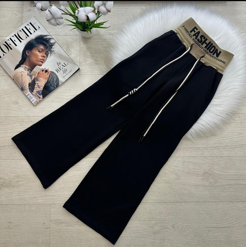 через кнопку купить только полная оплата!; Стильные брюки палаццо с широкой резинкой 🤩🤩🤩 Плотна резинка 👌🏻 Детализирующие двойные кулиски в поясе 😍 В боках кишеньки 😎 Ткань: турецкая двунить 💙 Производитель: Украина 🇺🇦 р.164-1шт ЗАМІРИ ⤵ +/- 1-2см!!! р.164-длина 104см/ шаг 74см/ ПОС 50см