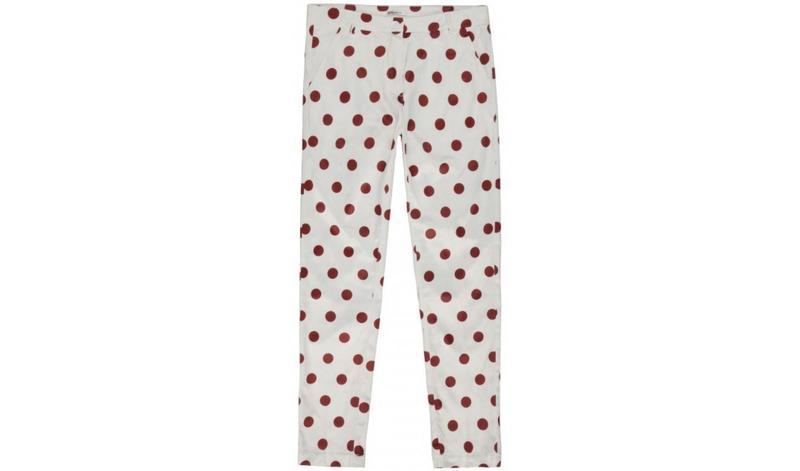 55% полиэстр,43% хлопок,2% эластан брюки для девочки белого цвета в коричневый горошек.