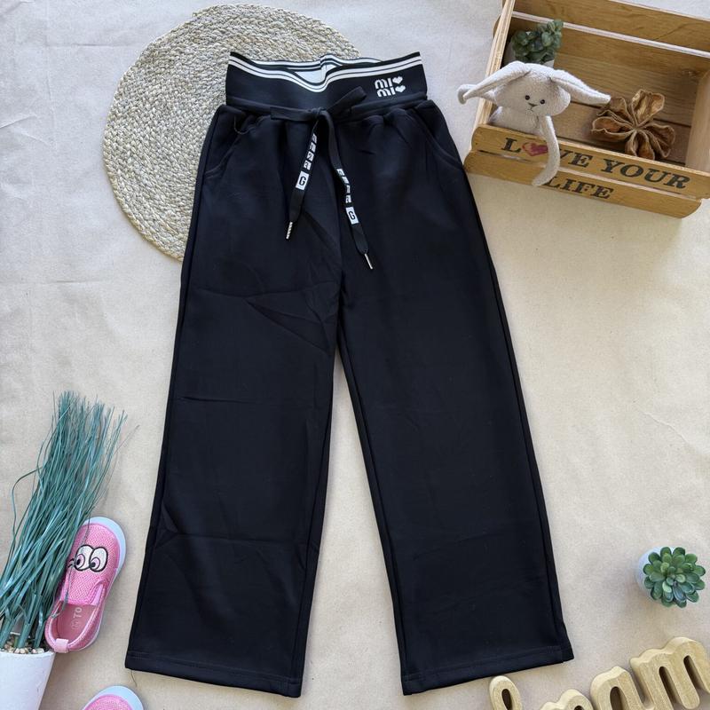 Удобные и практичные трикотажные брюки - палаццо.В поясе - широкая резинка и шнуровка. Размеры: 122 (по набору 75) - длина 77 / крок 50 128 (по бірці 80) - 81 / 52 134 (по бірці 85) - 86 / 57 140 (по бірці 90) - 94 / 64