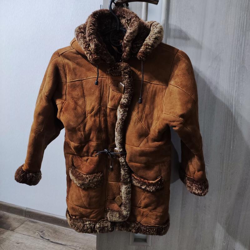 Детсая дубленка натуральная на 3-4 года Теплая, зимняя дублёнка на ребенка. Натуральная кожа, овчина, с капюшоном В хорошем состоянии, есть один небольшой недостаток - змейка рабочая, а бегунка нет.