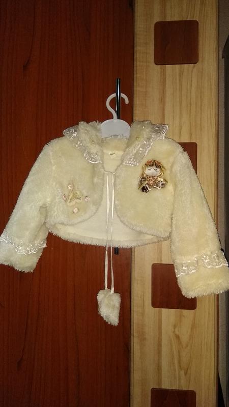 Болеро на 1,5-2 годика. Длина болеро 21 см, длина рукава 28 см. Цвет белый (на фото более желтый получился)