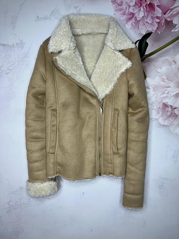 Стильная дубленка с косой молнией Внутри полностью на теплом меху Спереди есть 2 кармана Состояние идеальное 🏷️Kiabi 10 лет/140 р Длина 49. ПОГ 40. Рукав без подворота 54
