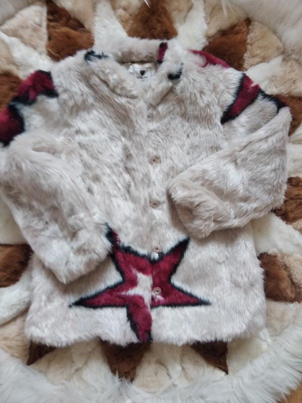 Теплая шубка с интересным рисунком. Ширина 37см, длина 50см, рукав 40 см.