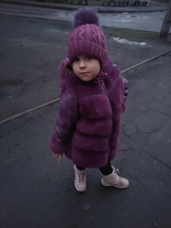 Зимняя куртка, шубка с кожаными вставками фиалкового цвета (фиолетового). Состоние очень хорошее, дыр и пятен нет. Легкая и удобная шубка, любимая шубка моей дочери. Застегивается на молнию. Эко кожа выдерживает до -10 градусов. Подойдет приблизительно на 6-7 лет. На фото дочери 6 лет, в рукаве еще есть запас. Шапку покупала под эту шубку, она тоже в продаже. Шапка 170 грн.