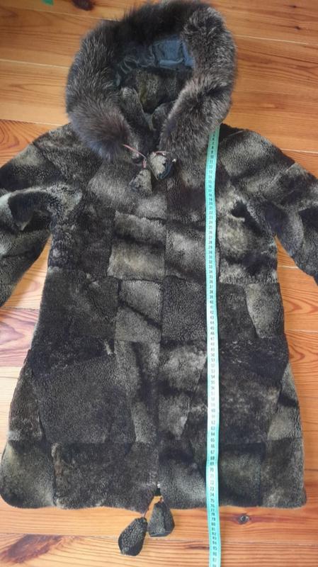 Шуба из кусочков мутона в красивом состоянии. Застежка молния, съемный капюшон.