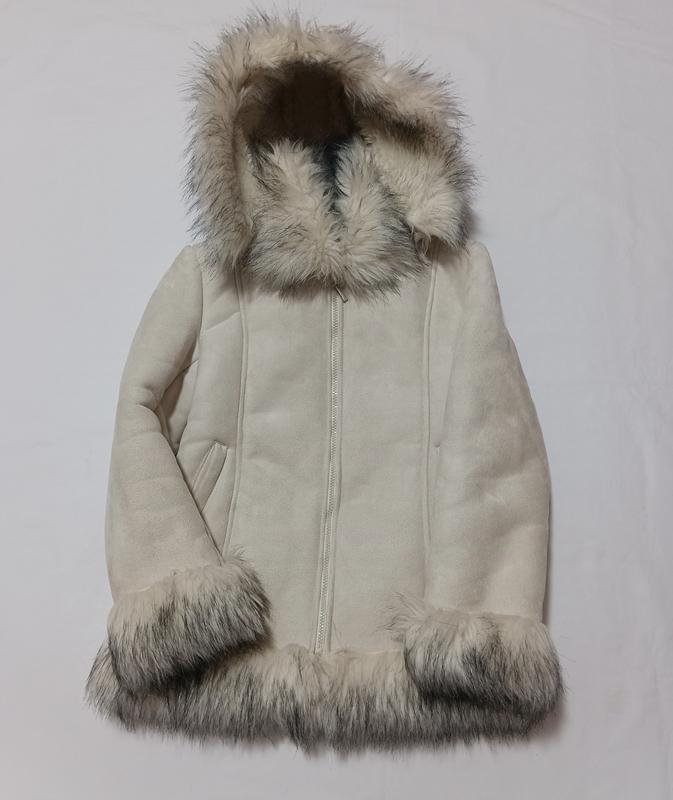 Длина 62 см Плечи 39 см Обх.грд 45 см Рукав от плеча 53 см Штучне хутро. Капишон снимается. Застежки все работают.