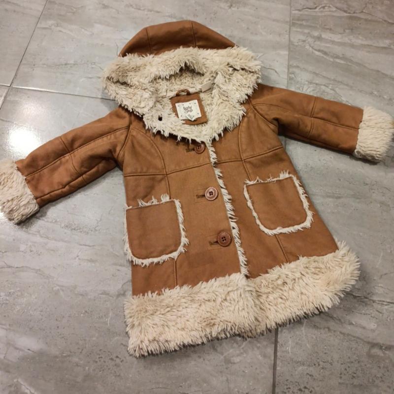 Зимняя теплая дубленка для девочки 98 размер 2-3 года с капюшоном. красивая длинная детска...