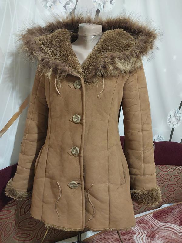 Дубленка искусственная, мех на капишоне натур. 44, 47 г. длина 80см. рукав 60. ПОГ 40. Теплый, внутри искусственный мех