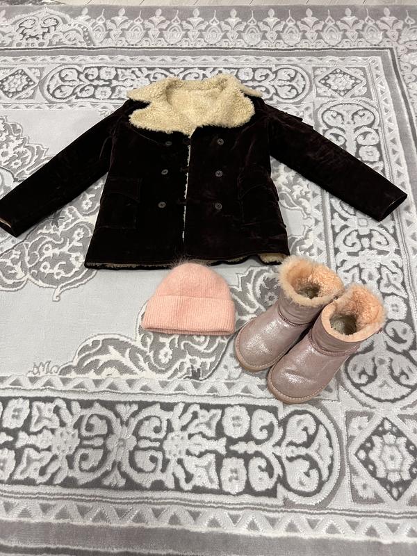 Дубльонка для дівчинки стан нової зсередини на овчині верх велюр коричневого кольору дуже гарно дивиться . На ґудзиках а також є кишені . Стан нової оділа раховані рази