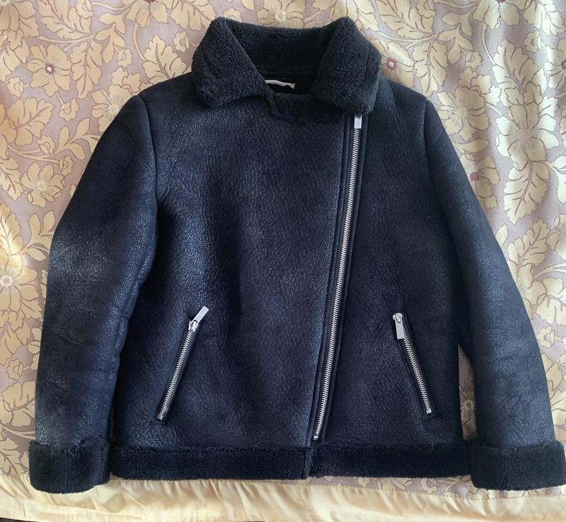 Якісна , тепла та красива штучна дубляночка Mango . Стан ідеальний, чорна з легкою лазерною обробкою, не затирається і має охайний вигляд . Розмір 140, але носили від 137 до 146 . Орієнтуйтеся по замірах. Довжина по спинці 51см, напівобхват під рукавичками 46см, рукав від плеча 49 см, плечі 35см.