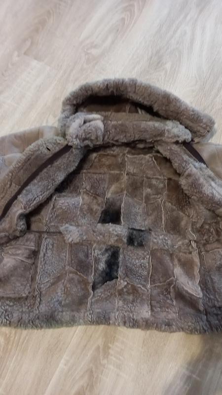 Пошита з кусочків натурального хутра,заміри всі вказані на фото.Є невеликий дефект(теж є на фото) несправний замок в капюшоні.Дуже тепла та зручна,замочок закривається додатково ґудзиками.Капюшон можна забрати.