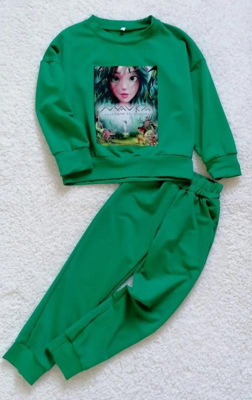 Стильный костюм с изображением любимой героини мультфильма «Мавка» Тканина двухнитка,кофтинка прикрашена подвійним прогумованим накатом, штаны в талии под широкую резинку есть карманы. длина/рукав от горловины/пог/брюки длина/шак 116см - 37/40/47/67/49см —2шт