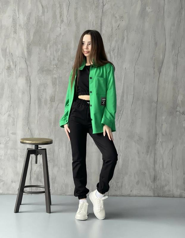Модний костюм 3-ка -джогери -топ -рубашка тканина двохнитка пеньє гарної якості заміри-довжина рубашки \пог\рукав\довжина топа\пог\довжина штанів\крок\стегна\пояс 128-розм-58\45\47\30\33\79\54\40\24см