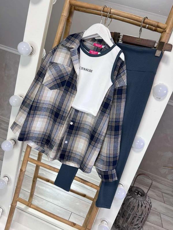 НОВИНОЧКА Комплект Рубашка, майка и лосины очень удобен для сезона весна-лето рубашечная ткань и трикотаж рубчик майка с накатом лосины красиво сидят на стройной фигурке ГАРНАЯ КАЧЕСТВО рост/длин, рубашки/пог/рукав от горловины/длин, майки/пог/длин,лосин/крок/пот похибка+-2см 140/63/48/64/34/32/82/58/23-1шт 146/65/50/68/35/34/85/61/24-1шт 152/68/53/71/37/35/88/64/26-1шт 158/70/55/74/39/36/92/68/27-1шт