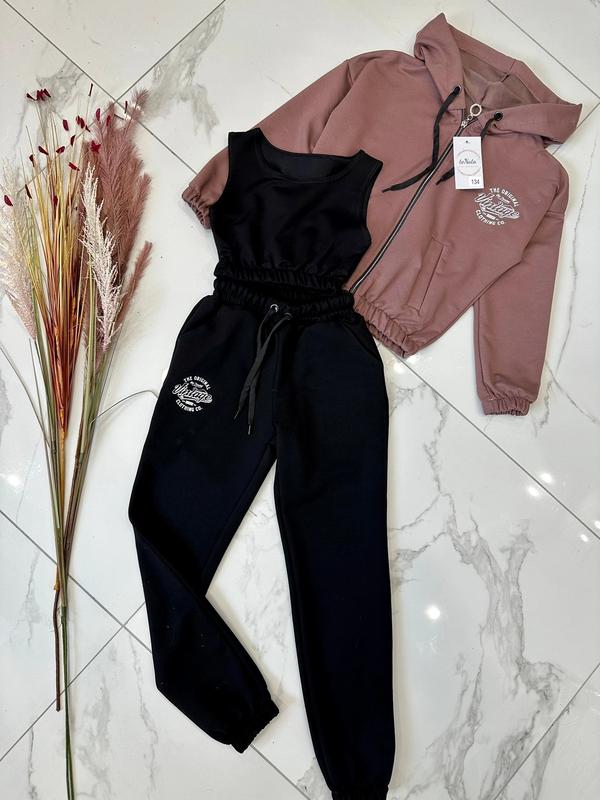 В наличии 🧡 Спортивный костюм тройка из турецкой качественной двухухнити Качественная двухкомпонентная печать Кофта на молнии, есть карманы Брюки на резинке есть рабочий шнурок и карманы КАЧЕСТВО ЧУДОВА!! РЕКОМЕНДУЮ!!! замеры: длина кофты/пог/рукав от горловины/длина брюк/шар/пот/поб/длина топ/п***********/78/56/26/40/27/30 146-51/50/62/84/61/28/43/29/32