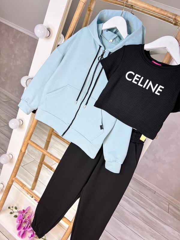 Крутой яркий костюм-тройка для модницы, Тканина двухнитка і рубчик , Кофта с капюшоном на молнии с карманом кенгуру, Брюки на резинке и карманами, легкий, подойдет для прогулок и занятий спортом. размер-длина-длина\рукав от горловины\пог-длина брюк\шаг\пояс- длина футболочки от горловины>пог 146-53\60\54-85/61/27-33/35