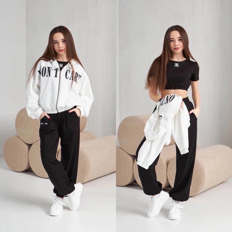 Мега крутой костюм тройка с качественным накатом Худи, джоггеры и топ худи на молнии с капюшоном и карманом кенгуру манжеты под резинку Брюки под широкую резинку, есть карманы низ также под резинку Ткань люкс качества двунитка пенье Не кашлатиться! Рекомендую ! Рост/длин./пог/рукав от горловины/длин.топа/пог/длин.штанов/крок/пот/пот похибка+-2см 140/43/53/57/22/33/90/66/27/48
