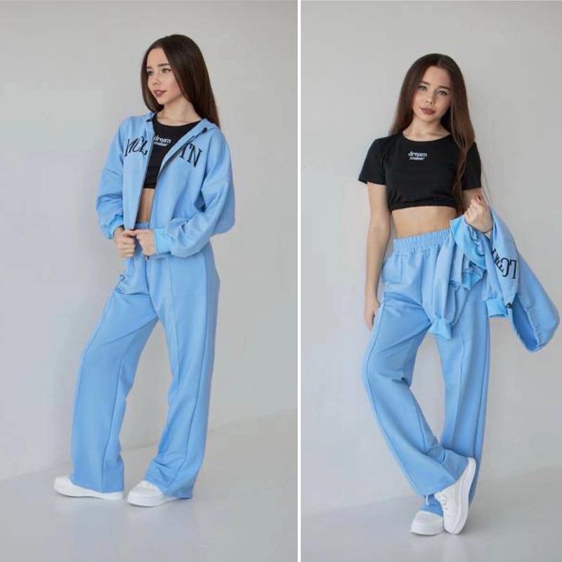 Стильная весенняя тройка Кофтинка на замочку Штаны палаццо Топ Ткань двунить качества пенье Бомбер на манжетах КАЧЕСТВО ЧУДОВА!! РЕКОМЕНДУЮ!!! 140-1шт долж./пог/рукав от горловины/длин.топа/пог/длин.штанов/крок/пот/пот/победер 140/43/53/55/22/33/90/66/27/47