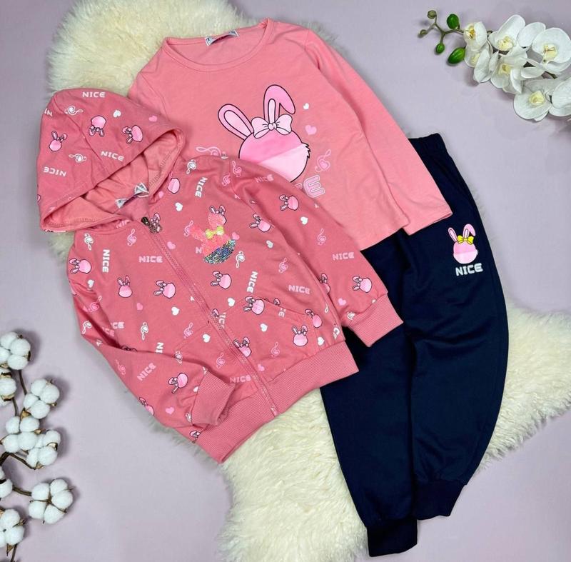 🌸Костюм тройка Зайчик Nice. Кофточка с капюшоном и карманами спереди. Застежка на замочке. Брюки с карманами, в поясе резиночка. Легкий реглан с рисунком. Рисунок-накат, пайетки пришиты, переворачиваются. Тканина двунитка. Производитель Венгрия модные 📐Замеры: 116 - кофт. довж. 41/ полуобхив 34/ руки 35/ брюки длин 61/крок 40 122 - кофт. довж. 44/ полуобхив 35/ руки 36/брюки длин 65/крок 45 128 - кофт. довж. 45/ полуобхив 36/ руки 39/ брюки длиннее 70/шаг 49 134 - кофт. длж.49/ полуобхв 38/ рук 42/ брюки длин 76/крок 53 140 - кофт. довж. 51/ полуобхив 39/ руки 45/ брюки длин 81/крок 59 146 - кофт. довж. 52/ полуобхив 41/ рук 48/ брюки длин 83/крок 61