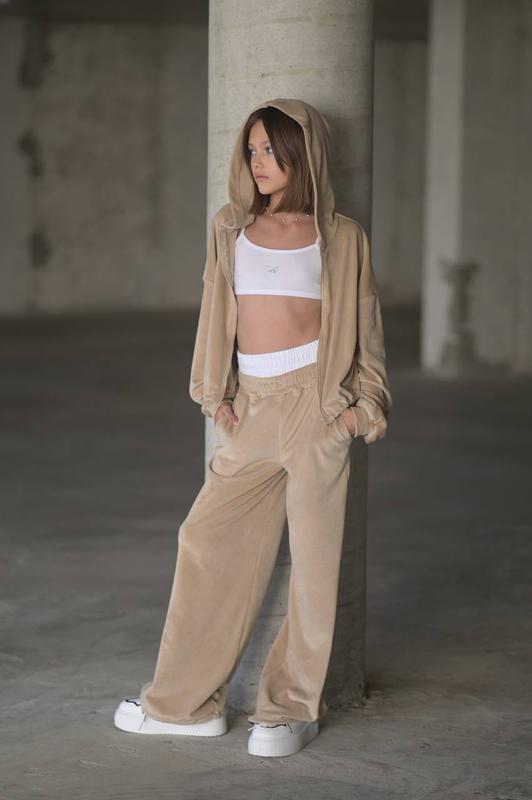Велюровый подростковый костюм с двойным белым поясом - тренд 2025 года! ‼️No2458!!️ ➡️Цена - 880!!️‼️‼️ Ткань - турецкий велюр высокого качества не линяет, не скатывается. Брюки палаццо регулируются резинками на фиксаторах, которые превращаются в джоггеры, двойной пояс. Кофта внизу на резинке с фиксаторами!!️ Размеры- 146-152, 152-158 158-164 164-170 Цвет - бежевый, черный, коричневый.