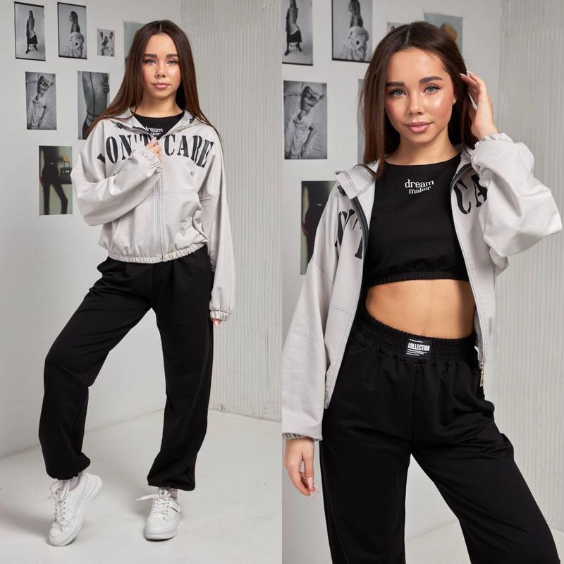 Костюм тройка с качественным накатом Худи, джоггеры и топ худи на молнии с капюшоном и карманом кенгуру манжеты под резинку Брюки под широкую резинку, есть карманы низ также под резинку надпись на топе может быть другая Ткань люкс качества двунитка пенье Не кашлатиться! Рекомендую ! Рост/длин./пог/рукав от горловины/длин.топа/пог/длин.штанов/крок/пот/пот похибка+-2см 140/43/53/57/22/33/90/66/27/48 146/46/57/61/25/35/94/68/28/49 152/49/60/64/27/38/96/71/29/51 158/51/61/66/30/39/99/72/30/52 164/53/63/69/32/41/103/76/31/53