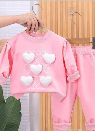 📝 Очень красивый костюм для девочек 🖤 Очень нежный цвет 🖤 Тканина - бавовна стрей, приємна на дотик 🖤 Кофтинка прикрашена атласними 3D сердечками 🖤 На брюках есть карманы 🖤Код: 41 Замеры 90-Длина кофты 37 см Рукав от горла 34 см ширина 32*2 см Длина брюк 52 см шаг 28 пояс 17*2 см 100-Длина кофты 38 см Рукав от горла 36 см ширина 34*2 см Длина брюк 56 см шаг 32 пояс 18*2 см 110-Длина кофты 40 см Рукав от горла 40 см ширина 36*2 см Длина брюк 57 см шаг 36 пояс 19*2 см 🧸Цена 680 грн