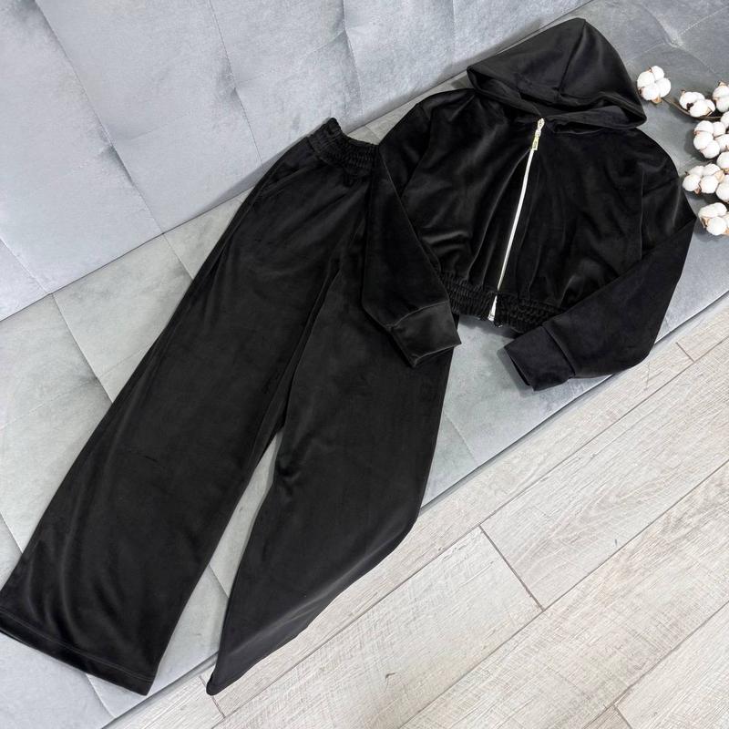 Костюм підлітковий велюровий, чорний. Кофтинка на замочку з капюшоном. Штани палаццо з кишенями. Тканина королівський велюр. Розмір 140, 146