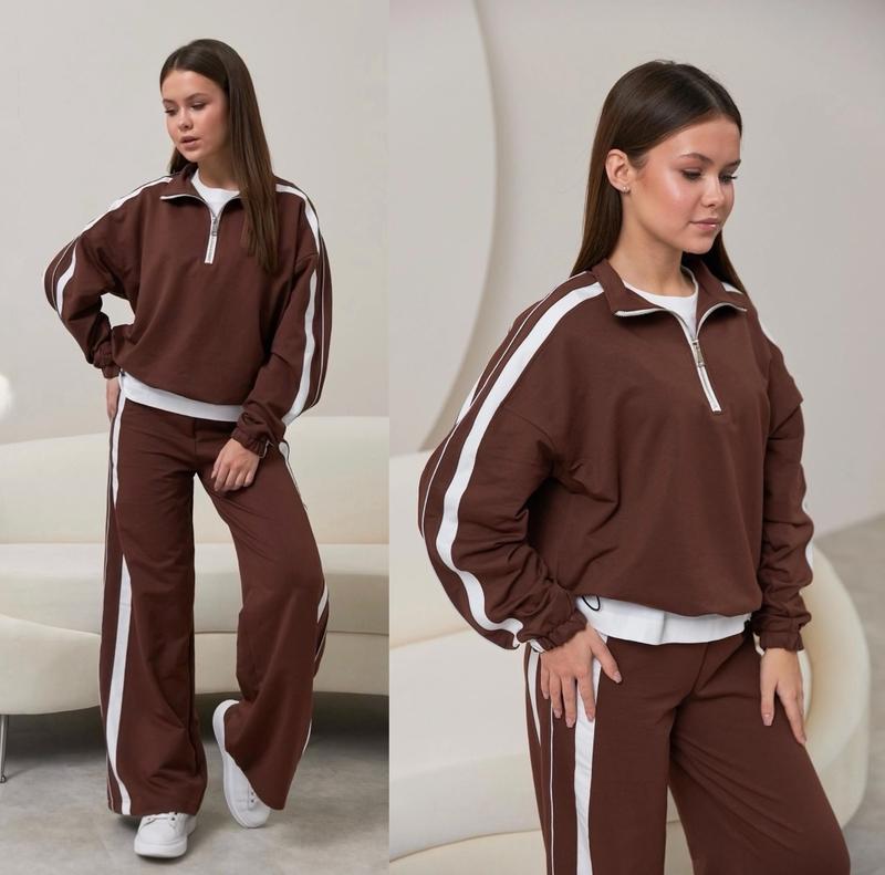 через кнопку купить только полная оплата;! арт 6083 Стильный костюм украшен кантиком и трендовыми полосками стильная олимпийка свободного кроя с фиксаторами-столками по бокам и широкие брюки под резинку ткань турецкая двунитка пенье рост/длин.олимпийки/пог/рукав от горловины/длин.штанов/крок/пот/пос похибка+-2см 146/49/54/61/94/66/26/43-1шт Тан