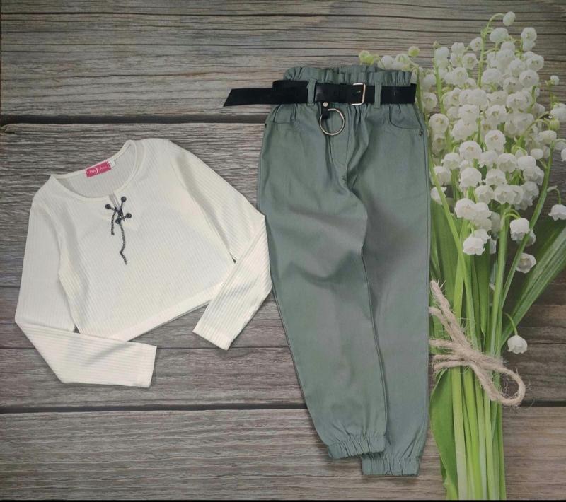 Стильный костюм для девочки. Брюки из стрейч-котона с идеальной завышенной посадкой Лонгслив отлично тянется, материал мустанг. Ремень входи в комплет Замеры 128-134 (1шт) -длина 32см, рукав 49см, пог 33см; длина штанов 75см, шаг 54см, пояс-23см, поб 36см 140 (1шт)- длина 34см, рукав 52см, пог 34см; длина штанов 79см, шаг 57см, пояс 25см, поб 37см 146 (1шт) длина 36см, рукав 54см, пог 35см; длина штанов 83см, шаг 60см, пояс 26см, поб 38см 152 (1шт) длина-38см, рукав-55см, пог 37см; длина штанов 86см, шаг 62см, пояс 27см, поб 40см 158(1шт) длина 41см, рукав 58см, пог 38см; длина штанов 90см, шаг 65см, пояс 28см, поб 42см
