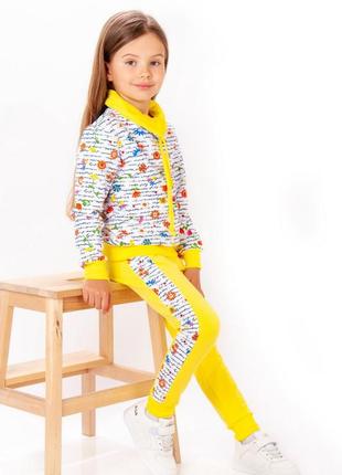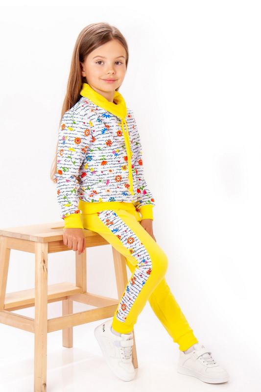 Костюм для девочек пошит из качественного трикотажного полотна футер двухнитка. Стандартный размерный ряд 98-122. Состав: 95% хлопок, 5% эластан. Верх костюма интересен воротником - хомутом. Низ и манжет на рукаве , эластичное полотно - рубчик .Брюки стандартной длины. Однотонные ,со вставкой из цветного полотна. Манжет рубчик. Пояс под резину , вставлен шнурок.