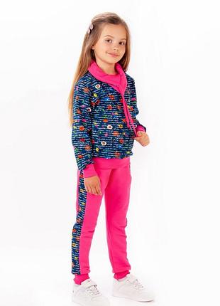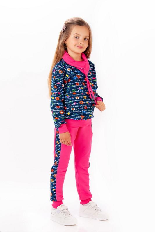 Костюм для девочек пошит из качественного трикотажного полотна футер двухнитка. Стандартный размерный ряд 98-122. Состав: 95% хлопок, 5% эластан. Верх костюма интересен воротником - хомутом. Низ и манжет на рукаве , эластичное полотно - рубчик .Брюки стандартной длины. Однотонные ,со вставкой из цветного полотна. Манжет рубчик. Пояс под резину , вставлен шнурок.