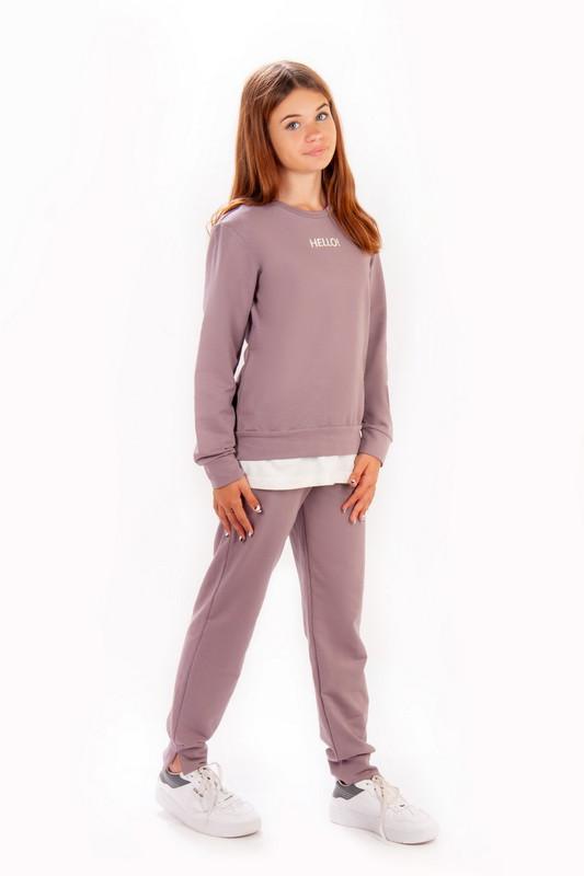 Костюм для девочек - подростков из трикотажного полотна двухнитка футер. Состав: 95% хлопок ,5% эластан . Джемпер с длинным рукавом . Акцентом является вышивка и низ оформленный баской .Длина и ширина стандартны. Брюки стандартной длины соответствующего размерной таблицы. Имеют карманы. Акцент - манжет с разрезоми. Для удобства вставлен шнурок. Рост модели : 147 см.