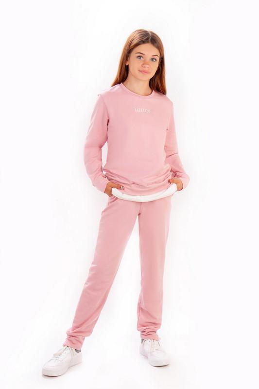 Костюм для девочек - подростков из трикотажного полотна двухнитка футер. Состав: 95% хлопок ,5% эластан . Джемпер с длинным рукавом . Акцентом является вышивка и низ оформленный баской .Длина и ширина стандартны. Брюки стандартной длины соответствующего размерной таблицы. Имеют карманы. Акцент - манжет с разрезоми. Для удобства вставлен шнурок. Рост модели : 147 см.