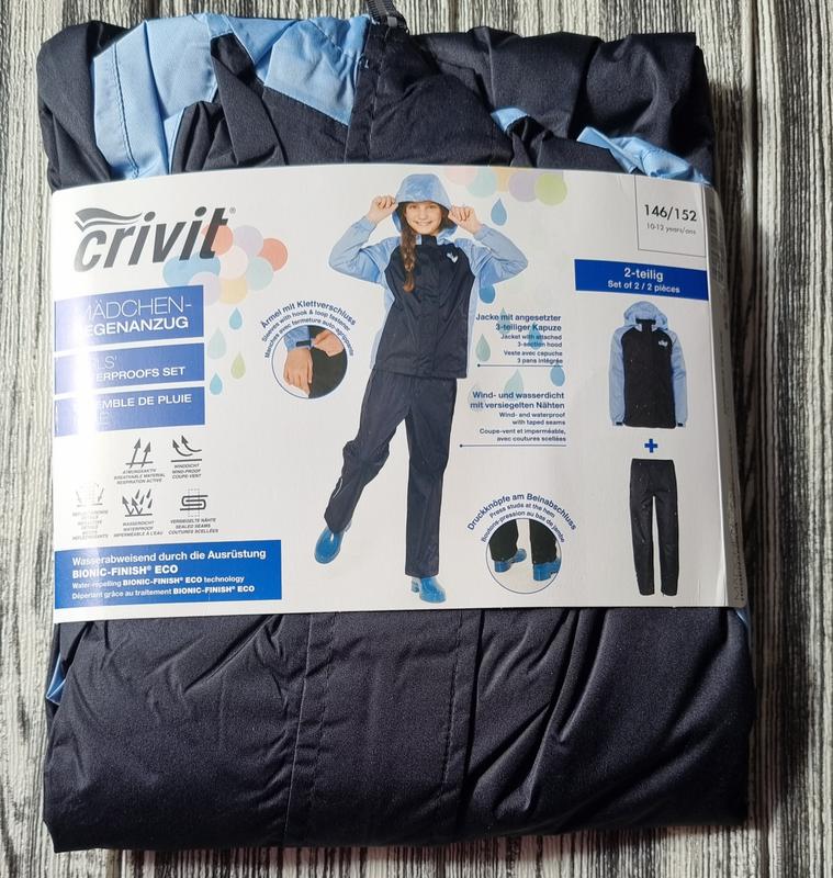 Костюм спортивний вітровка дощовик Crivit Sport Куртка сітка +штани+ сумка для зберігання Німеччина З герметичними швами, вітрозахисна, відштовхує воду і бруд. Верхній матеріал витримує водної стовб 3000 мм і має задовольняє екологічним вимогам покриття Bionic FINISH® Eco , який дозволяє стікати краплях з водою. Вентиляційне отвір на спинці. Блискавка із захистом підборіддя. Манжети рукавів на липучках. Дві кишені. Вітровка на підкладці, застібається на блискавку і липучки. Капюшон вшитий. Спереду прорізні кишені. Для дівчинки на зріст 146/152 см