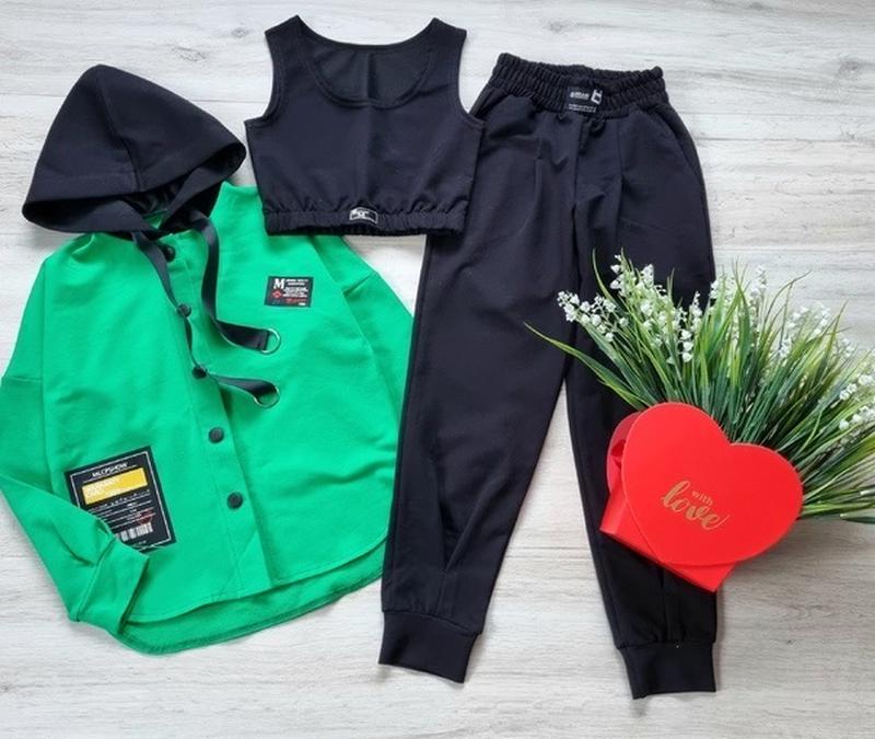 Стильный костюмчик рубашка+топ+штаны ткань турецкая двухнитка пенье не кашлатится ОТЛИЧНОЕ КАЧЕСТВО!!! 140(2 шт)-длина рубашки 57,пог 52,рукав от горловины 64,длина штанов 84,шаг 58,пояс 25,поб 47,длина топа 32,пог 39 146(2 шт)-длина рубашки 59,пог 53,рукав от горловины 65,длина штанов 86,шаг 60,пояс 25,поб 48,длина топа 33,пог 40 152(2 шт)-длина рубашки 61,пог 54,рукав от горловины 67,длина штанов 88,шаг 61,пояс 26,поб 50,длина топа 34,пог 41 158(2 шт)-длина рубашки 63,пог 55,рукав от горловины 70,длина штанов 91,шаг 63,пояс 28,поб 52,длина топа 35,пог 42 164(2 шт)-длина рубашки 64,пог 56,рукав от горловины 73,длина штанов 95,шаг 66,пояс 30,поб 55,длина топа 37,пог 43 Цена 675
