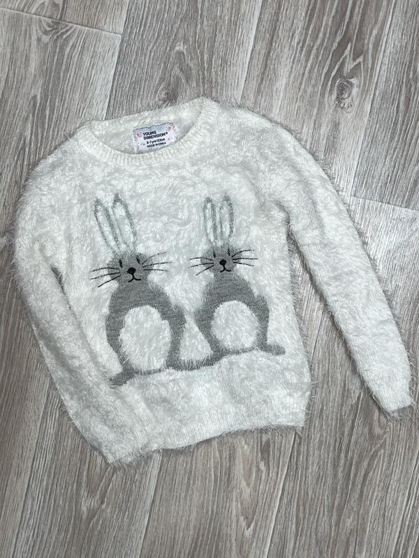 Свитерок травка Состояние идеальное без нюансов Цвет белый, зайчик серенький 🏷YD 6-7 лет длина 42. ПОГ 32+. рукав 42